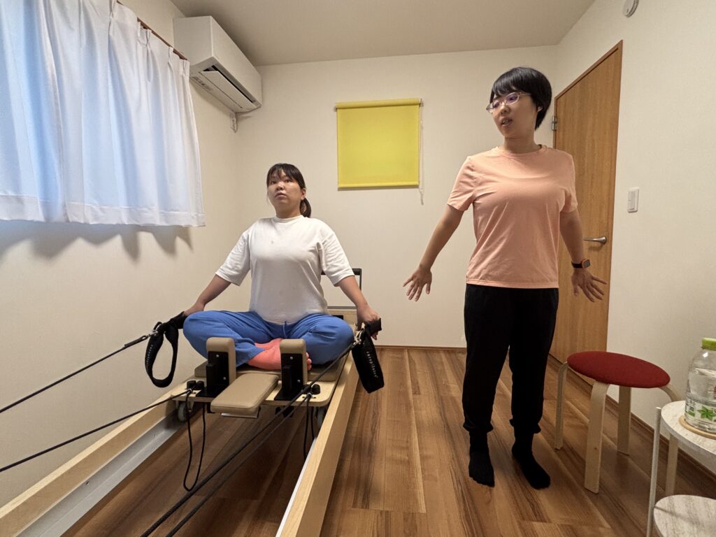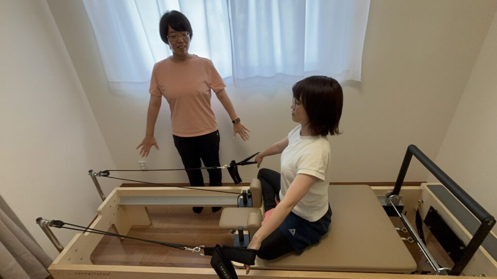 リフォーマーというピラティスマシンを使って体を動かしていきます。